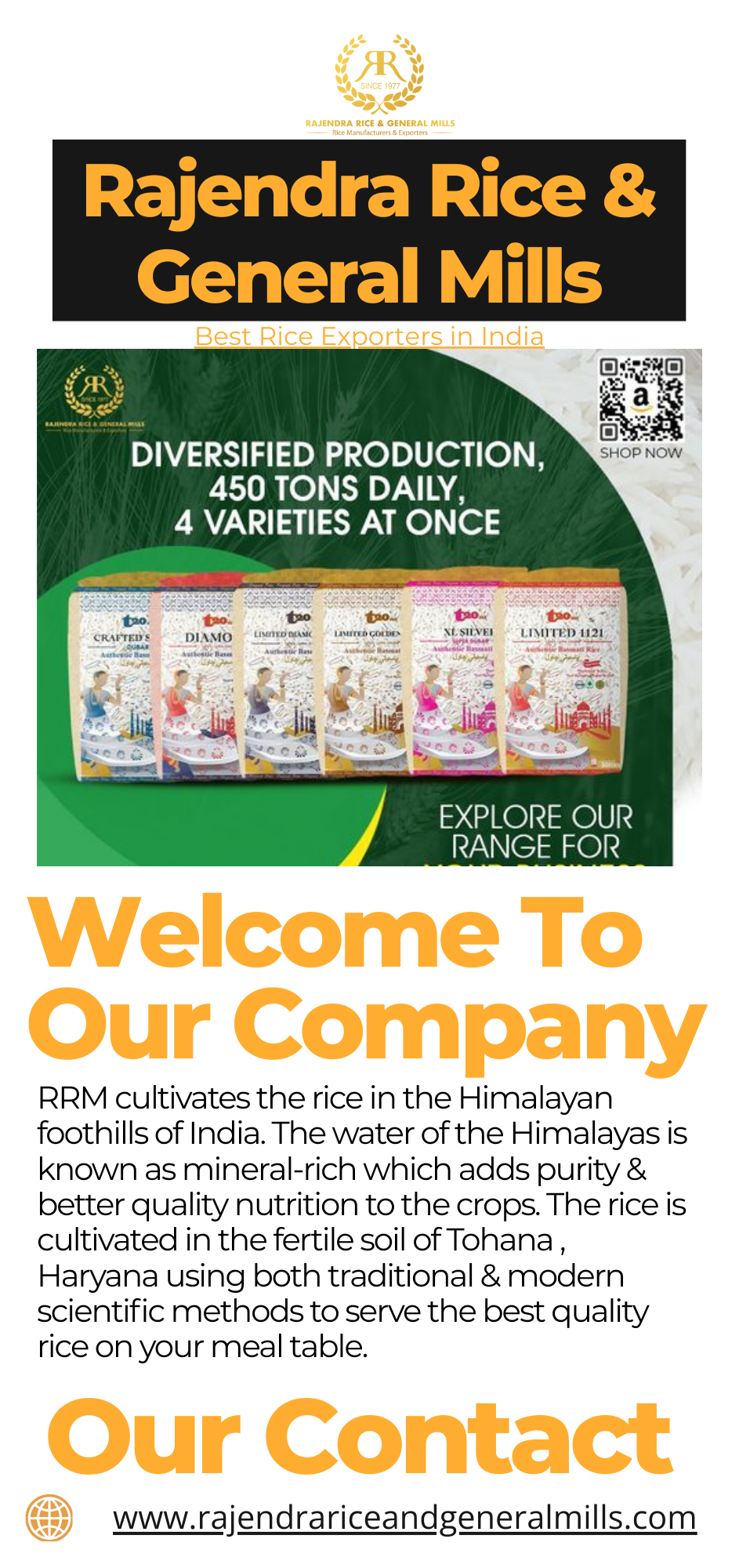 Rajendra Rice & General Mills, based in Tohana, Haryana, is a leading exporter of premium Basmati Rice Exporters. With a legacy spanning over 44 years in rice milling and more than 283 years in rice cultivation, the company combines traditional expertise with modern technology to deliver high-quality rice products. Their state-of-the-art facilities and stringent quality control measures ensure that each grain meets international standards. Exporting to over 15 countries, Rajendra Rice & General Mills is committed to excellence, sustainability, and customer satisfaction in the global rice market.